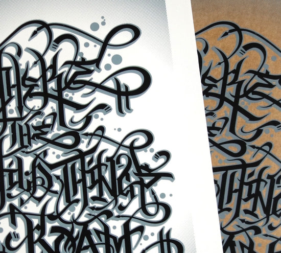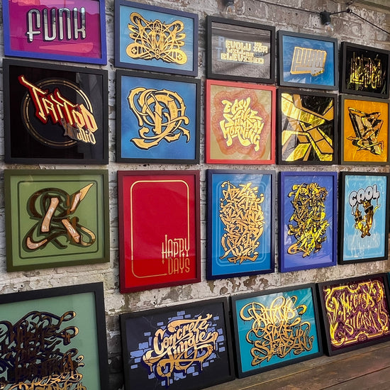 It was during this time, working with signs and fuelled by his graffiti background, that his passion for lettering, gold gilding, and screen printing was born.